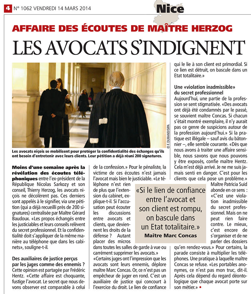 Voir l'image agrandie Une violation inadmissible du secret professionnel Direct Matin – Côte d’Azur – Édition du vendredi 14 mars 2014. Par Marc CONCAS|2017-01-22T17:43:32+01:0014/03/2014|Non classé|0 commentaire Share This Story, Choose Your Platform! facebooktwitterpinterestvkEmail À propos de l'auteur : Marc CONCAS